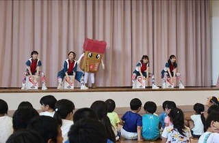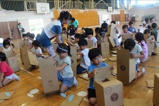 Cheeky(チーキー)の皆さんによるパフォーマンスから活動がスタートしました。初めて見るボルカホンのパフォーマンスに興味津々の子供たち。次に、ボルカちゃんによるダンボールクイズが行われました。