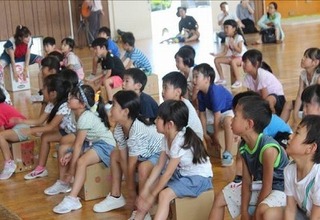 ダンボール製のカホン(以下、ボルカホン)の楽器づくり&演奏のワークショップを行いました。当日は、「タイヨー株式会社」から取締役の小泉さんが来校してくれました。そして、ボルカホンのパフォーマンスを行っているCheeky(チーキー)の皆さんとキャラクターのボルカちゃんも一緒にワークショップを行いました。
