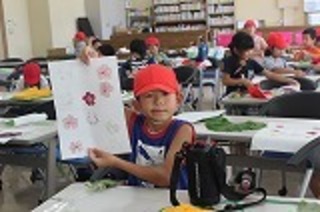 最初は、力加減が難しく、色がよく出ないものもありましたが、繰り返し活動を行っているとだんだん上手にできるようになってきました。こすり出した花や葉っぱは、画用紙に貼って一人一人の作品に仕上げています。葉っぱを何枚か使って巨大な魚を表現する子、花や葉っぱを貼った後につるや虫を描き込む子、花の上で楽しそうに遊んでいる妖精を描く子・・・。子供たちの創造力は素晴らしいです。
