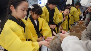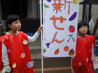 いよいよ本番!始めは、緊張からかなかなか自分から動くことのできなかった子供たちでしたが、慣れてくると自分から声を出してお客さんを呼び込み、チラシを配ったり朝市のよさを伝えたりしていました。笑顔で一生懸命に活動する子供たちに、声をかけてくださるお客様も多かったようです。