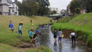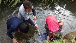 市ノ橋~岡田橋付近の青田川探索に出かけました。水も透き通り、美しい青田川の様子を感じながら活動に取り組みました。この日は、カマツカやウキゴリなど、10匹以上の魚を捕まることができました。学校の水槽にも魚が増えました。