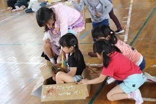 探究の学習で「みんなでわくわく スマイルランド」をテーマに、年間を通して遊び場や遊びに使うもの(以下、ランド)をつくる活動を行います。4月から活動が始まり、子供たちは、自分のやりたいことやつくりたいものを考えてランドの活動を行っています。