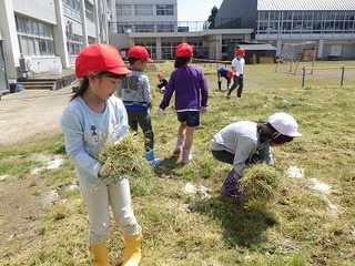 4か月近く雪の下だった畑はカチコチで、草もたくさん生えていました。そこで、みんなで草取りや草捨てを行いました。もくもくと草を抜く子、抜いた草の土を払い落す子、両手いっぱいに草を抱えて捨てにいく子、みんな一生懸命働きました。土の中から顔を出したミミズに、「土のお仕事ご苦労さん」と声をかけるなど、微笑ましい様子もありました。