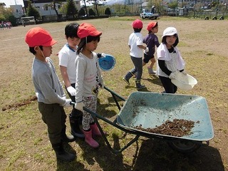 昨年一生懸命お世話をした「きらら」と「らら」のボロが栄養満点のたい肥になることを知ると、「きららとららからのプレゼントだ!」とみんな喜んでいました。手や靴が汚れることなど少しも気にしないで、「先生、もっと入れてください!」とバケツに山盛りのボロを運んだり、大切そうに畑にまいたり、がんばっていました。