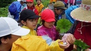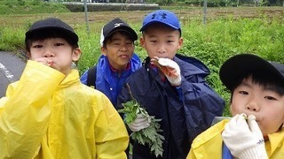 朝市で興味をもった「山菜」への理解を実体験を通して深めたいと、牧のふれあい体験交流施設へ行って来ました。施設に着くとすぐに、山菜を見たり採ったりするため散策しました。ヨモギやフキの葉、クズの芽などが多く生えており、それらの特徴を教えてもらうと、子供たちは道端をよーく見て、次々に見つけて摘み取っていきました。それ以外にも、タンポポの茎で笛を作ったり、花の蜜を吸ったり、ミントを摘んで嗅いでみたりと、山菜以外の野草や自然にもたくさん触れ合うことができました。最後に若竹天ぷらのお土産までいただき、大満足な体験となりました。