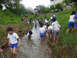 探究の時間を心待ちにしている子供たち。今日は、南本町方面の青田川へ出かけました。アクアシューズを履いて、網に水槽とやる気満々の子供や、図鑑を片手に植物探しにワクワクしている子供、発見したことをメモ帳に書こうとしている子供もいて、それぞれ思い思いがやりたいことを胸に、勇んで出かけていきました。