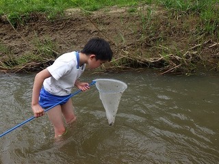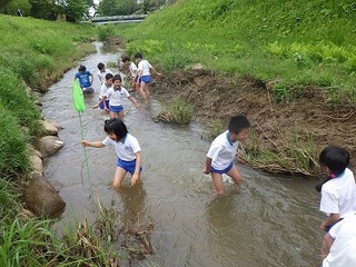 恐る恐る水の中に足を入れたり、網を使って魚を捕まえようと走り出したり、どの子も活き活きと活動に入りました。「自分のやりたいこと」が明確な時、子供たちの探究力のスイッチは一気に入ります。