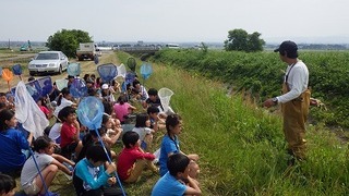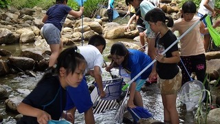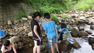そして、川に入り、坂田さんといっしょに採集活動が始まりました。とにかく無我夢中に、たもと虫かごを持ち、没頭する子供たちです。しばらくすると、「先生!カニがいました。」「見たことないカエルがいました。」など、捕まえては歓声をあげる様子が見られました。