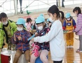 「ダンボールランド」の地図を見せながら、園児さんに「どこに行きたいかな?」「どれで遊びたい?」とやさしく聞きながら、遊びたい遊び場へ連れて行ってあげる姿がたくさんありました。遊び場に連れていくと、「輪ゴムをここに引っ掛けて・・・」「ここに靴を脱いでね。」などと遊び方を説明したり、やって見せてあげたりして、園児さんに合わせて活動していました。子供たちにとって、とても楽しく充実した活動になったようです。