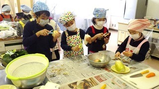 まずは、第一部、「お野菜料理のおもてなし」です。事前に話し合って決めた「秋冬野菜たっぷりカレー」「とろーりチーズの大根ステーキ」「葉物野菜のツナとコーン和え」を作りました。