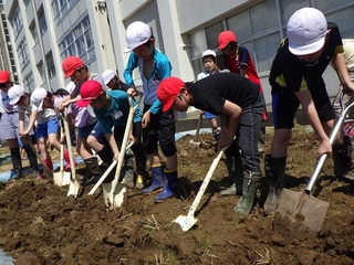 探究の活動で,5年生は学校グラウンド横の田んぼで米作りを行うことにしました。機械を使わずに,自分たちの手で田植えまで進めることにしました。まずは固くなった田んぼの土をスコップやくわで起こします。