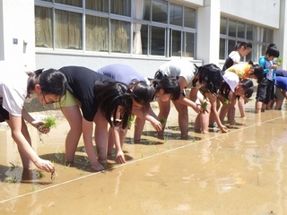 このような準備を経て,いよいよ田植えの日を迎えました。腰をかがめて植えるのは思った以上の重労働。米作りにはこんなにたくさんの苦労があることを実感しました。