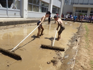 2回の田起こしの後,田んぼに水を入れ代掻きです。土を細かくした後にならします。水をたくさん含んだ泥をならすのは一苦労でした。