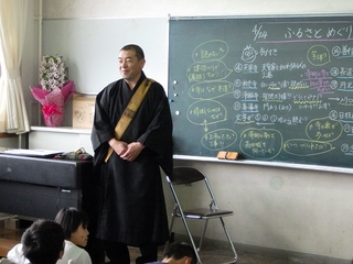 後日,寺町町づくり協議会,善行寺住職の西山要耕さんが学校に来てくださり,子供たちが感じた思いや多くの疑問に答えていただきました。また、寺町の歴史についてお話を聞くことができました。寺町めぐりを通して,自分たちのふるさとである城下町高田について探究していくことに気持ちが膨らんできました。