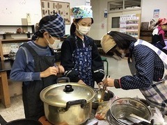 まずは,朝食作りです。この班は,卵を混ぜてスクランブルエッグ作りから取り掛かりました。卵の殻が上手に割れました。美味しくできそうな予感・・・!