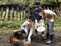 屋外では,火おこしをして飯ごう炊飯にチャレンジ!火加減の調節は,学校で練習してきたことを生かしました。昨日に引き続き、天候に恵まれた中,活動ができています。