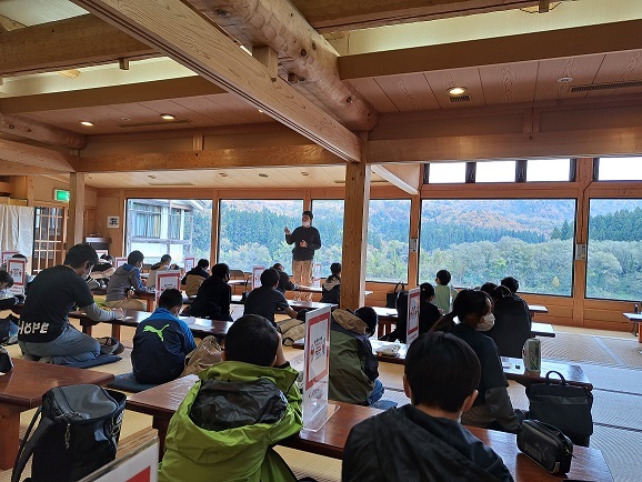 狐の嫁入り屋敷にて、パンとおやつ奥阿賀コンビリーの柳沼さんから、お店のコンセプトやパンや地域への思いについてお話しを聞かせてくれています。