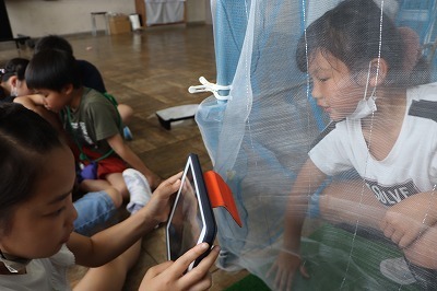 高田城址公園で採ってきたモンシロチョウが飛び回れる場所をつくりました。初めて間近で見るチョウには,「目が緑色だよ!」と新たな発見があったようです。