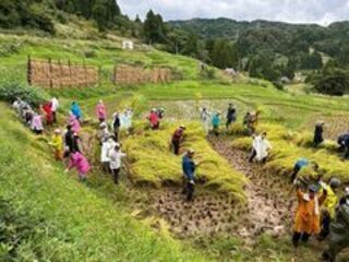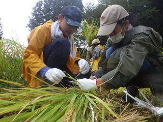 9月28日(木)に中ノ俣で稲刈りを行いました。心配された天気ですが,稲刈りを始めた時には雨はあがり,刈り取った稲をはさに掛け終わった頃には太陽まで出てきて,天も味方しての稲刈りとなりました。