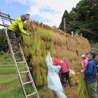 仲間と協力し,刈り取った稲を「はさ掛け」できるように紐で結びました。最初は稲がばらばらになったり,結び目がほどけたり,うまくいきませんでしたが,だんだんと手際よくできるようになりました。