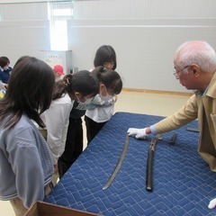 刀を見る前に,花岡さんが「この刀は牛木吉十郎(猫又を倒したと言われる中ノ俣の人)が猫又を退治した時に使ったものか,退治した褒美としてもらったものか」と問われました。そしてその答えは,刀をよく見れば分かると言われました。子供たちは早く確かめたくて仕方がないという様子でしたが,花岡さんから「刀に息を吹きかけないでほしい」と注意を受け,子供たちはいよいよ「この刀はただものではない!」という気持ちになったようです。口を手でふさぎ(健気な子供たちです!)息を殺して刀を観察しました。刀には越前の国で作られたこと,「葵のご紋」が刻まれていました。