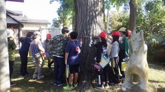 最後に神社の境内にある銀杏の木の下に猫又が眠っているということで,木の幹を優しく撫で,次の目的地の上越歴史博物館に向かいました。