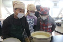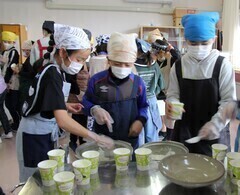 探究「中ノ俣とわたし」の活動の中で,子供たちが中ノ俣の棚田で育てたお米を「お家の人にも食べてほしい!」という願いをもちました。そこで,JA上越の方からご協力いただき,土鍋でお米を炊き,おにぎり作りをしました。