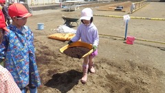 次の活動では、肥料を自分たちでまいて混ぜました。初めて見る肥料に興味をもち、どんなにおいがするのかを調べていました。