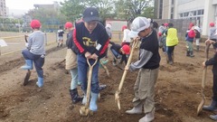 2年生の探究では、野菜を育てて、収穫した野菜を使って「たいようレストラン」を開くことに決めました。早速、畑に入りスコップを使って耕しました。