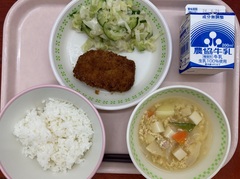 写真は、新潟県にちなんだ献立で、「タレカツ」「たけのこ汁」です。