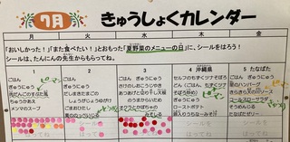 校内で掲示している給食カレンダーを活用した取組として、「おいしかった」「また食べたい」と思った夏野菜メニューの日にシールを貼ってもらっています。