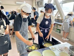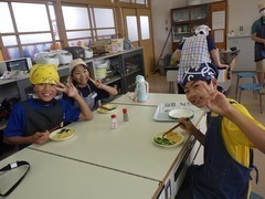 火加減や炒める時間など,グループごとに調整して作りました。「テーブルを拭いて,お皿を並べるね」「使ったものを先に洗っておくよ」など,手の空いている子は,進んで仕事を見付け,作業していました。仕事を分担して,手際よく調理できるところは,「さすが6年生!」といった様子でした。