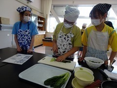 7月11日,家庭科で調理実習を行いました。3,4人のグループになり,「スクランブルエッグ」と「青菜の油炒め」を作りました。