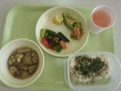 7月19日に「たいようクッキング」を行いました。献立は、ピーマンピザカップ、ナスと油揚げの味噌汁、きゅうりとトマトの中華サラダ、しそジュース、しそふりかけです。みんなで協力して作りました。