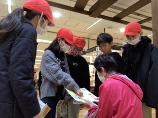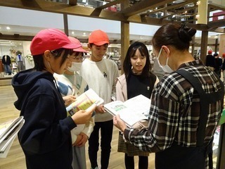 今回は,宿泊体験活動の活動班でPRを行いました。声をかける人,情報誌の説明をする人,聞き取ったことをメモする人など,班のメンバーで分担して,協力して活動しました。