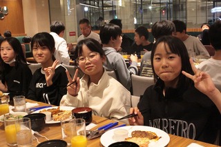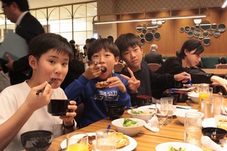ホテルでの夕食。ハンバーグにエビフライに,おいしいおかずがいっぱい!