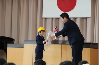 1年生の代表として、記念品と交通安全帽を受け取りました。とても堂々としていて素晴らしかったです。