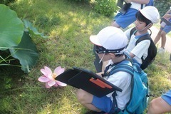 お堀の外周コースを沿って歩くと、ハスの花や葉がすぐ近くまで伸びているものがありました。「ハスの花ってさわるとやわらかい。」「ハスの花はよくみると,中心にアイスのコーンのようなものがあるね。」「ハスの真ん中のかたいところは“かたく”っていうんだね。“かたく”ってなんだろう」などと気付きや疑問をもちました。ハスについての興味や疑問を解決しようと、さっそく学校へ戻り調べ学習を進めていました。