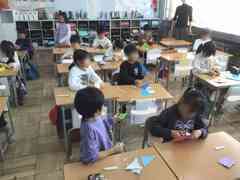 算数「分数」の学習をしました。2つに分けたものの1つ分を「2分の1」ということを、折り紙を切って確認しました。大きい折り紙と小さい折り紙の2分の1を作ると、「もとの大きさがちがうと、2分の1の大きさもかわるんだね」と、算数の考え方モンスターの「ヒトッツくん」が使えることに気づくことができました。
