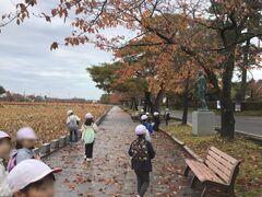 公園の中を歩きながら、子どもたちは木の葉の色や形、空気のにおいなど、身の回りにある秋の変化を五感で感じ取っていました。