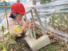 「冬もピーマンもお世話を続けたい」と、管理員さんに相談をし、お野菜の小屋を作りました。小屋の中には落ち葉を敷き、温かいように工夫をしました。 水曜日には雪の予報が出ているため、雪対策にも力を入れています。寒さに負けず、お世話を続けていきます。