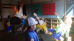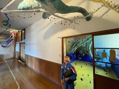閉校となった小学校を使っている『絵本と木の実の美術館』では,木や葉,植物の種,流木などを使ったアートを見学しました。当時通っていた子供たちの笑い声やおしゃべり,楽しかった思い出を物語調にして表現するアート空間を体験して,「あれは子供の足かな?」「壁の絵はひょっとして学校の思い出を表しているのかも?」と,想像力をはたらかせる子供たちの姿が見られました。