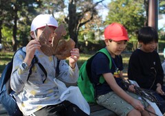 「目に見えないもの」のヒントを見付けた子供たちは,高田城址公園を探検していて集めた木の枝や松ぼっくりなどの木の実,色づいた落ち葉を使って,「桜守さんの思い」を伝えるアート作りを始めました。